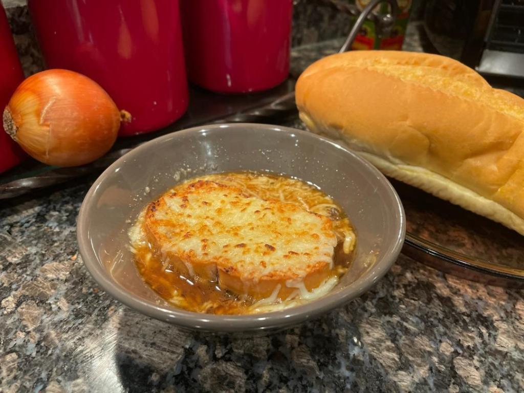 Caramelize the onions by heating butter and oil over medium heat. Add the onions, thyme and bay leaf. Cook on low heat until deeply caramelized, stirring occasionally to keep from sticking or burning. This takes about 45 minutes but is essential for developing the soup’s rich flavor. After the onions are caramelized, deglaze the pan with the white wine or vinegar/broth, increasing the heat to bring the mixture to a boil allowing the alcohol to evaporate. Add the beef broth and bring to a boil, reduce the heat and let it simmer. After the onions are caramelized, deglaze the pan with the white wine or vinegar/broth, increasing the heat to bring the mixture to a boil allowing the alcohol to evaporate. Add the beef broth and bring to a boil, reduce the heat and let it simmer. Preheat your oven to broil then ladle the soup into 4 oven safe bowls. Top each bowl with a toasted slice of French bread. Divide the grated cheese evenly among the bowls, ensuring each has a generous amount on top. Broil until the cheese is golden brown and bubbly, usually 3-5 minutes.